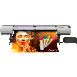 | The UJV55-320 printer feeds media up to 127.9 inches (3.2 m) wide for the largest of graphics and panels. It's also possible to simultaneously print onto two 60-inch (1.52 m) rolls. This dual-roll capability can double the productivity of a shop, with each rolls printing the same set of graphics, or completely different jobs. |